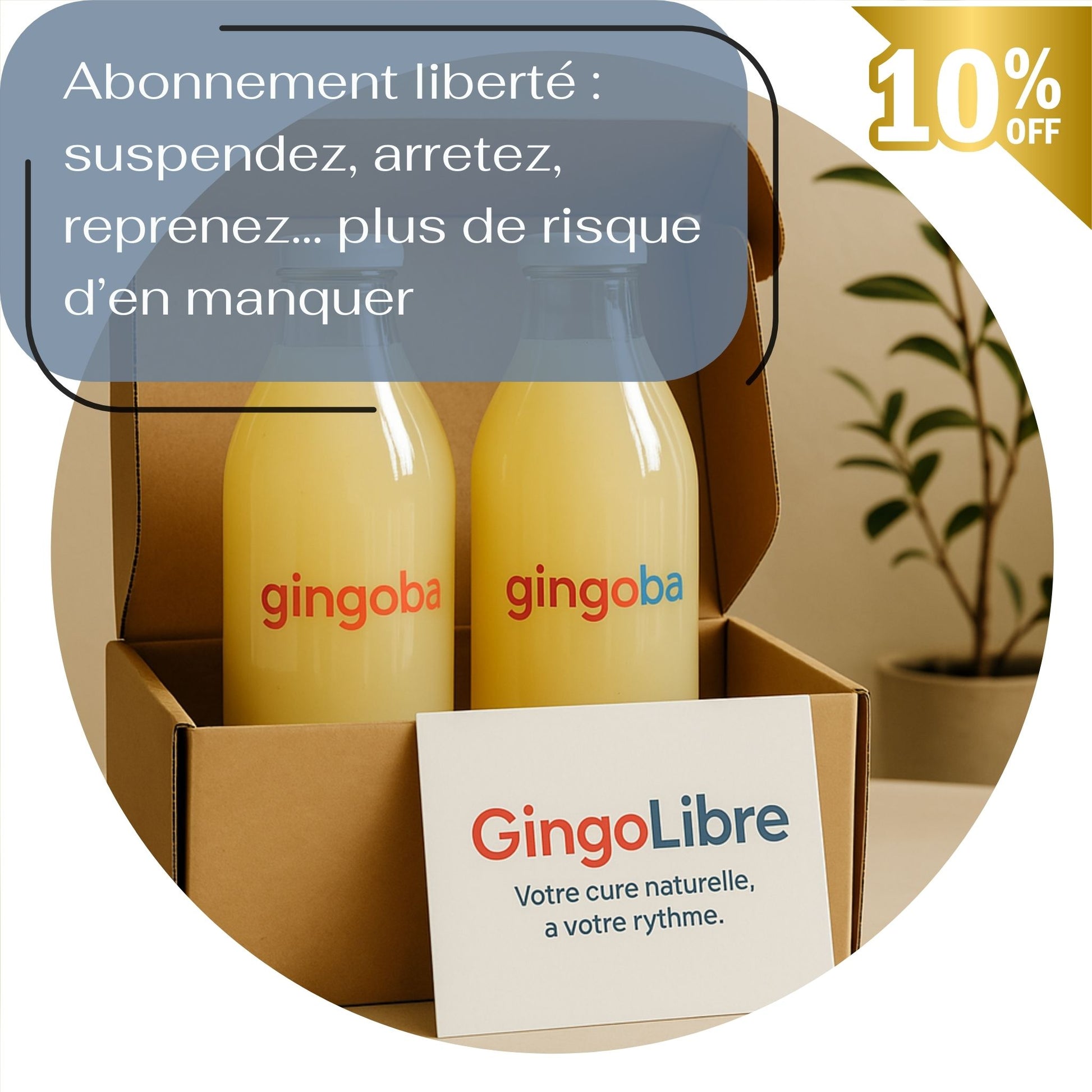 Avec l’abonnement GINGOBA™, recevez automatiquement votre pack de 2 bouteilles de 1 litre — une cure de 20 jours (1 bouteille tous les 10 jours) — directement chez vous.